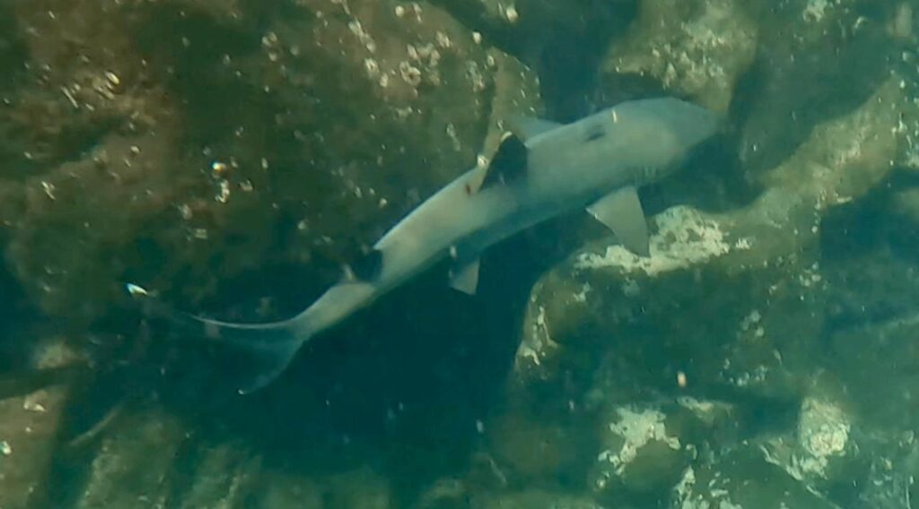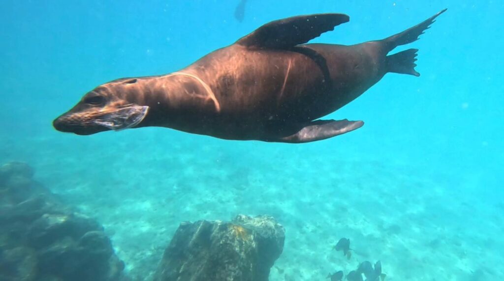 Snorkel Punta Carrión: En este punto realizamos una actividad de snorkel, donde tenemos la oportunidad de nadar junto a tortugas marinas, tiburones de punta blanca, tiburones de Galápagos y juguetones lobos marinos. La claridad del agua y la riqueza del ecosistema marino hacen de esta experiencia inolvidable.